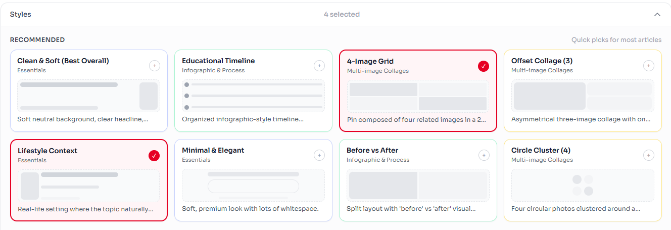 Select one style to apply to every URL, or pick multiple styles for variety. Each URL × style = 10 pins. 5 URLs × 10 styles = 50 pins.