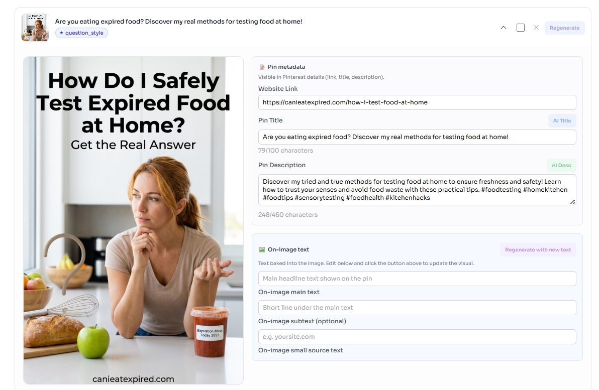 Tweak titles, descriptions, or links on any pin. Regenerate individual pins if needed.
