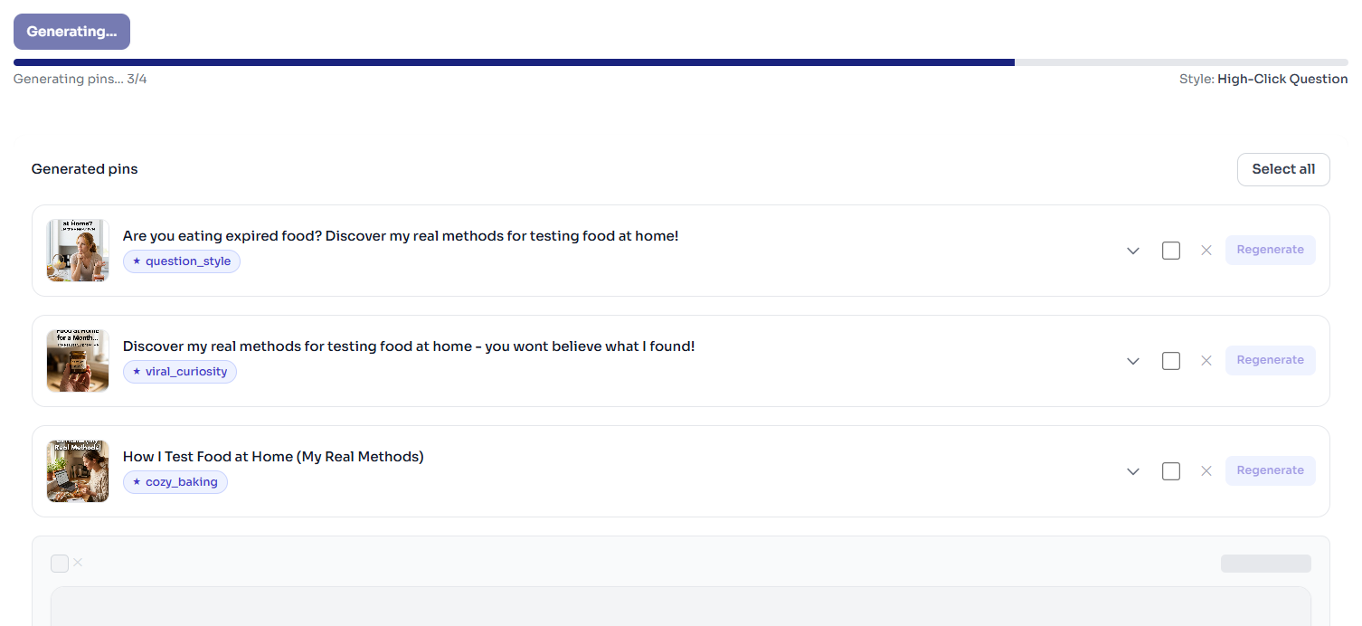 Click Generate. All pins are created in the background. Grab a coffee - you'll have 50 pins in under 12 minutes.