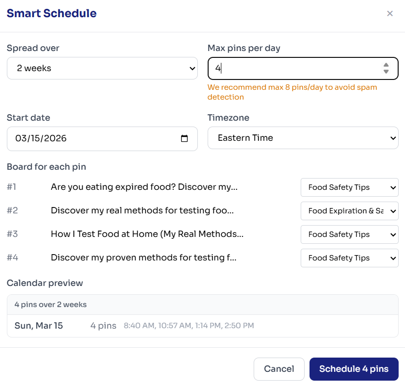 A good baseline is 5–10 fresh pins per post over time. If you want an intro workflow for a single post, see our guide on turning one blog URL into 10 pins.